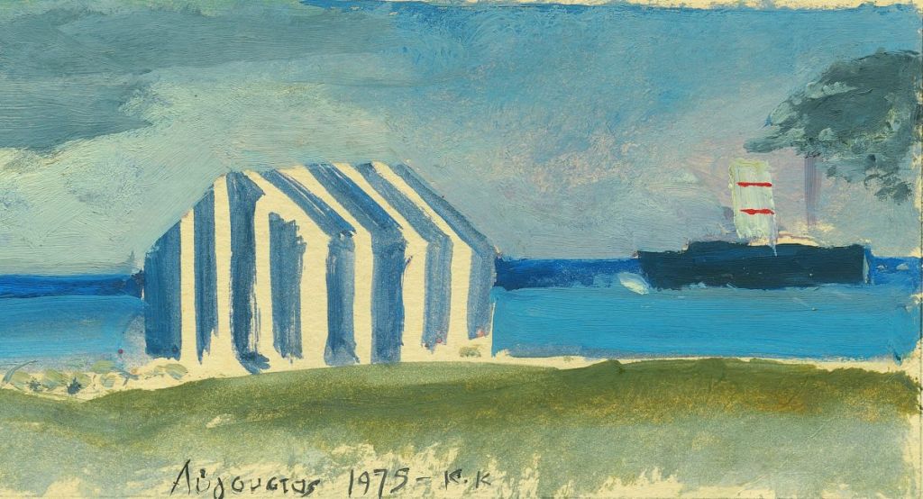 Κόκκινα σπίτια, ταμπάκικα στο Καρλόβασι, θάλασσες με καραβάκια, παραλίες με φυλάκια ή καμπίνες κυριαρχούν και επαναλαμβάνονται με διαφορετικούς τρόπους στο έργο του. Σχέδια με παστέλ, ακουαρέλες και ακρυλικά χρώματα συνυπάρχουν και συνδιαλέγονται με τα αρχαία γλυπτά και τα αρχιτεκτονικά μέλη στη μεγάλη κεντρική αίθουσα του Μουσείου.