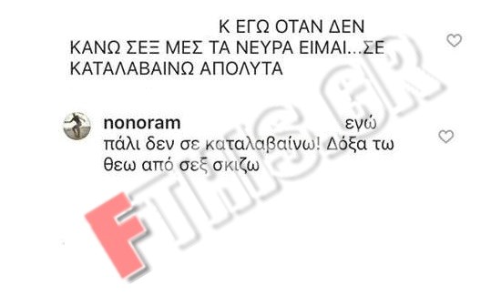 Ωστόσο, αυτό που μας έκανε εντύπωση, ήταν ένα παράδοξο σχόλιο που δέχτηκε η Ελεονώρα Μελέτη, από follower της για την σεξουαλική της ζωή: «Κ ΕΓΩ ΟΤΑΝ ΔΕΝ ΚΑΝΩ ΣΕΞ ΜΕΣ ΤΑ ΝΕΥΡΑ ΕΙΜΑΙ…ΣΕ ΚΑΤΑΛΑΒΑΙΝΩ ΑΠΟΛΥΤΑ…».