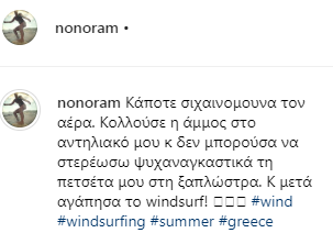 «Κάποτε σιχαινόμουνα τον αέρα. Κολλούσε η άμμος στο αντηλιακό μου κ δεν μπορούσα να στερεώσω ψυχαναγκαστικά τη πετσέτα μου στη ξαπλώστρα. Και μετά αγάπησα το windsurf!», έγραψε στην λεζάντα η δραστήρια παρουσιάστρια.