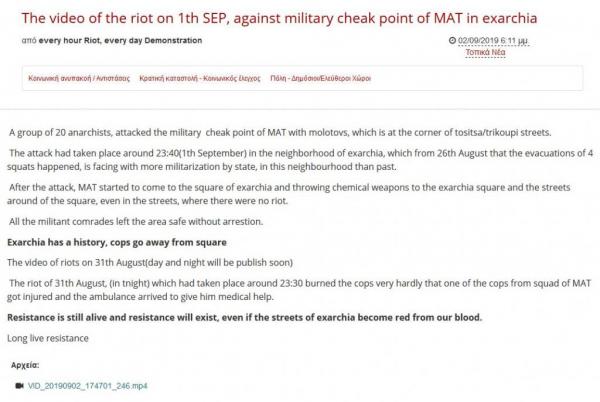 Όπως σημειώνεται στο κείμενο που είναι γραμμένο στα αγγλικά και συνοδεύει το βίντεο, η επίθεση πραγματοποιήθηκε το βράδυ της Κυριακής, 1η Σεπτεμβρίου στις 23.40, στη διασταύρωση των οδών Τοσίτσα και Τρικούπη «στην περιοχή των Εξαρχείων όπου στις 26 Αυγούστου έγινε η εκκένωση 4 καταλήψεων».
