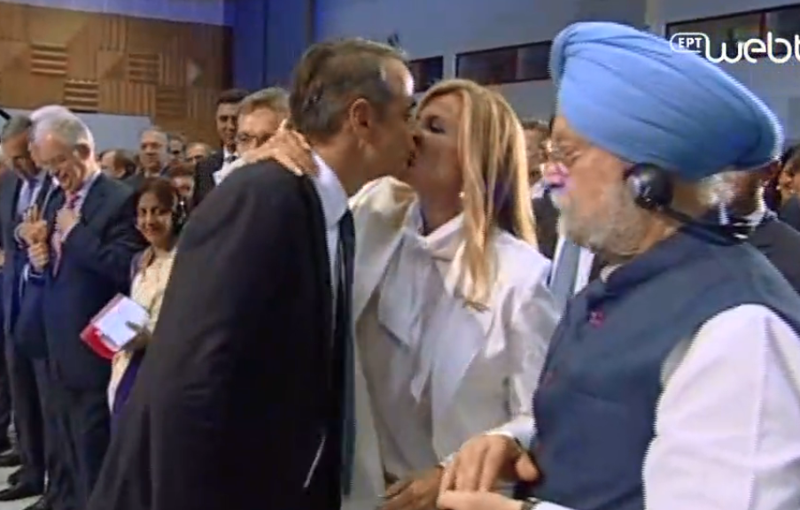 Με ένα φιλί στο στόμα εξέφρασε τα συγχαρητήριά της η Μαρέβα Μητσοτάκη στον σύζυγό της.