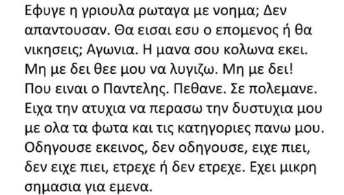 «Που είναι ο Παντελής; Πέθανε. Σε πολεμάνε. Είχα την ατυχία να περάσω την δυστυχία μου με όλα τα φώτα και τις κατηγορίες πάνω μου. Οδηγούσε εκείνος, δεν οδηγούσε, είχε πιει, δεν είχε πιει, έτρεχε ή δεν έτρεχε» αναφέρει στην προσπάθειά της να μεταδώσει τις πρώτες στιγμές αφού ξύπνησε στο νοσοκομείο, ενάμιση μήνα μετά το δυστύχημα.