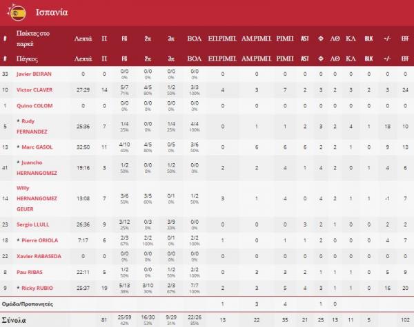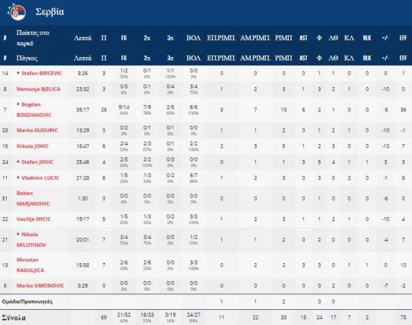 Το σύνολο του Σέρχιο Σκαριόλο είχε ως πρωταγωνιστές τους Ρίκι Ρούμπιο (19 πόντους) και Βίκτορ Κλαβέρ (14 πόντους), ενώ για τους Σέρβους πάλευε σχεδόν μόνος του ο Μπόγκνταν Μπογκντάνοβιτς που είχε 26 πόντους.