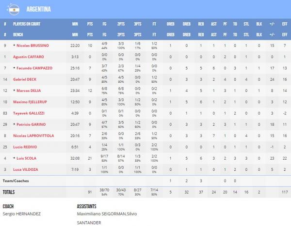 Πρώτος σκόρερ για τους Αργεντινούς ήταν ο Λουίς Σκόλα με 21 πόντους, σε ένα σημαδιακό γι’ αυτόν ματς καθώς πέρασε στη δεύτερη θέση των συμμετοχών σε Μουντομπάσκετ. Ο Ντέλια με 12 πόντους και ο Μπρουσίνο με 10 ήταν οι υπόλοιποι διψήφιοι της ομάδας.