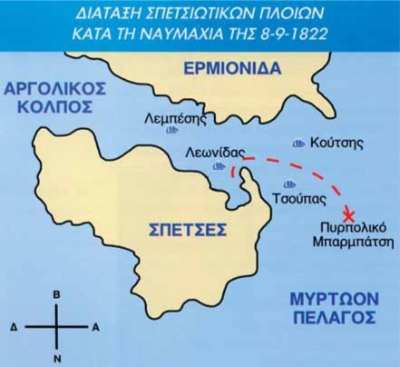Στις 8 Σεπτεμβρίου 1822 η τουρκοαιγυπτιακή αρμάδα φάνηκε στην είσοδο του στενού που χωρίζει τις Σπέτσες από την Ερμιονίδα. Προφανώς, στόχος του εχθρού ήταν πρώτα η προσβολή της νήσου των Σπετσών, που δεσπόζει στο στόμιο του Αργολικού Κόλπου και στη συνέχεια ο ανεφοδιασμός του Ναυπλίου. Ο Ανδρέας Μιαούλης, που είχε αναλάβει την ηγεσία του ελληνικού στόλου, διέταξε τα πλοία να τον ακολουθήσουν μέσα στο στενό, όπου θα ήταν ευκολότερο να συγκρουσθούν με τον εχθρό.