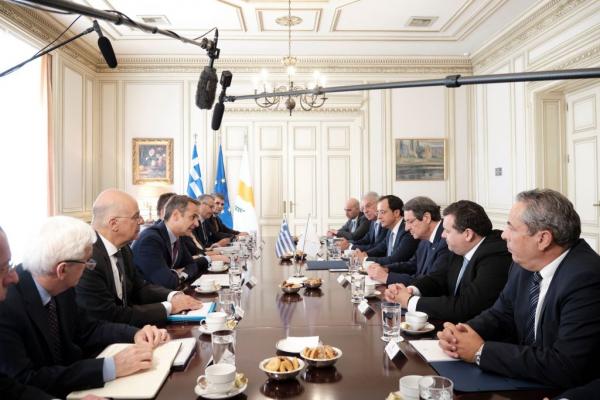 Στη σύσκεψη του Πρωθυπουργού με τον Πρόεδρο της Κυπριακής Δημοκρατίας μετείχαν από πλευράς της ελληνικής κυβέρνησης ο Υπουργός Εξωτερικών Νίκος Δένδιας, ο Υφυπουργός παρά τω Πρωθυπουργώ και Κυβερνητικός Εκπρόσωπος, Στέλιος Πέτσας, η Διευθύντρια του Διπλωματικού Γραφείου Πρωθυπουργού, Αλεξάνδρα Παπαδοπούλου, ο Διευθυντής του Γραφείου Υποθέσεων Ευρωπαϊκής Ένωσης της Γενικής Γραμματείας Πρωθυπουργού, Δημήτρης Μητρόπουλος, ο Γενικός Γραμματέας του Υπουργείου Εξωτερικών, Θεμιστοκλής Δεμίρης, ο Διευθυντής του Διπλωματικού Γραφείου του ΥΠΕΞ, Ιωάννης Τσαούσης και ο Διευθυντής Α2 Διεύθυνσης Κύπρου, Κωνσταντίνος Κόλλιας.