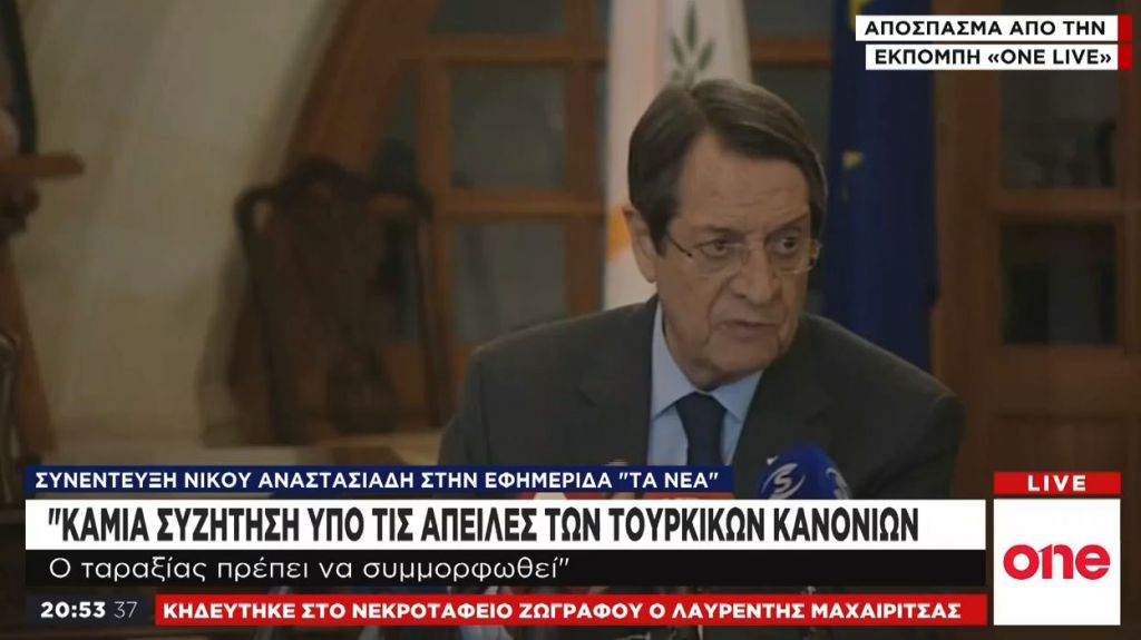 Ν. Αναστασιάδης στα «ΝΕΑ»: Καμία συζήτηση υπό τις απειλές των τουρκικών κανονιών