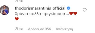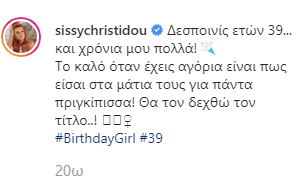 «Ευχαριστώ για τις ευχές και την αγάπη σας» δήλωσε στα Instagram Stories, η Σίσσυ Χρηστίδου, καθώς πλήθος followers της ευχήθηκαν τα καλύτερα. Ανάμεσα τους και ο πρώην σύζυγος της, Θοδωρής Μαραντίνης, που δεν παρέλειψε να της αφήσει το πιο γλυκό σχόλιο.