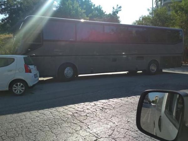 Τουριστικό λεωφορείο παρκαρισμένο σχεδόν κάθετα στο δρόμο σε διασταύρωση αφού εκεί βρήκε θέση ο ιδιοκτήτης του, φυσικά δίπλα στο σπίτι του.