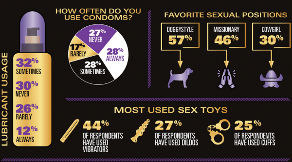 Το 57% δήλωσε ότι η «σκυλίσια» ήταν η αγαπημένη σεξουαλική τους στάση, με το «ιεραποστολικό» να έρχεται δεύτερο στο 46% και το «η γυναίκα απο πάνω» στο 30%.