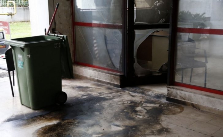 Ακολούθησε έκρηξη και πυρκαγιά, λίγο μετά τις 04.00 της Πέμπτης, με αποτέλεσμα να σπάσει η τζαμαρία και να μαυρίσει η είσοδος των γραφείων.