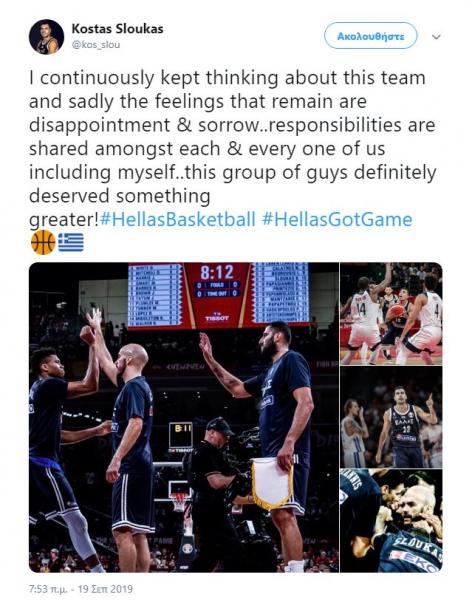 Απογοητευμένος και λυπημένος αισθάνεται ο Κώστας Σλούκας για την πορεία της Εθνικής Ελλάδας στο Παγκόσμιο Κύπελλο της Κίνας, ενώ τόνισε πως οι ευθύνες βαραίνουν τους πάντες