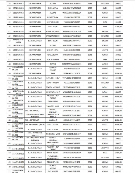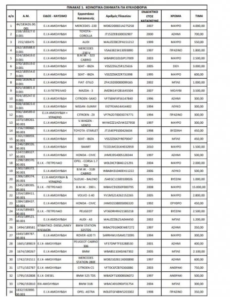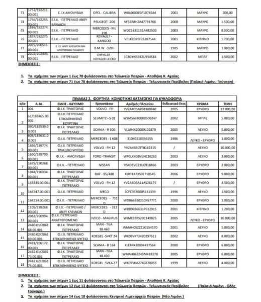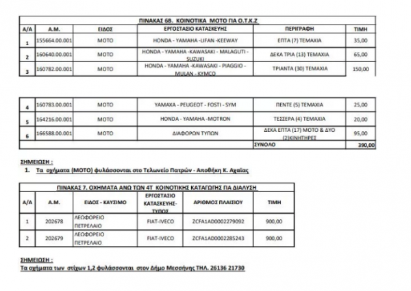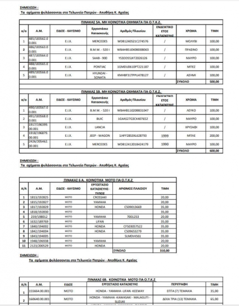 Τα δημοπρατούμενα οχήματα είναι μεταχειρισμένα, με ζημιές, φθορές και ελλείψεις και χρήζουν επισκευής πριν κυκλοφορήσουν. Οι ενδιαφερόμενοι οφείλουν να τα εξετάσουν μαζί με τεχνικούς της επιλογής τους πριν λάβουν μέρος στη δημοπρασία, προκειμένου να προσδιορίσουν το ύψος των ζημιών, ώστε να διαμορφώνουν ανάλογα και τις προσφορές τους.