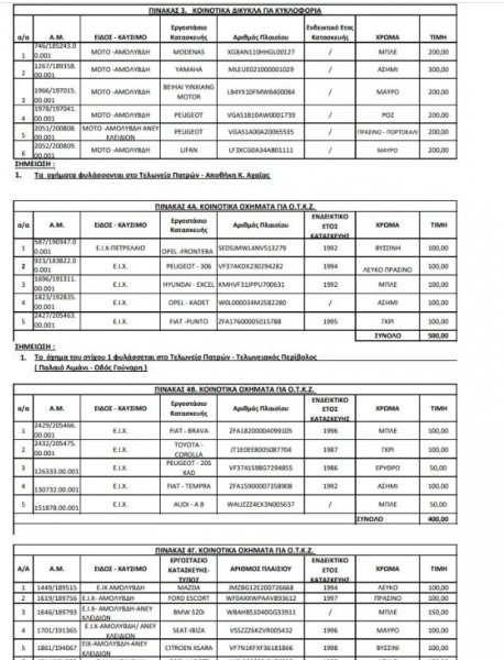 Οι αγοραστές των Ο.Τ.Κ.Ζ και των οχημάτων για διάλυση, κατά τον διακανονισμό υποχρεούνται επιπλέον να υποβάλουν υπεύθυνη δήλωση του Ν.1599/1986 ότι τα αγοραζόμενα οχήματα θα διαλυθούν και δεν θα τεθούν σε κυκλοφορία. Η επίσκεψη των οχημάτων στην αποθήκη της Κ. Αχαΐας επιτρέπεται ελεύθερα έως την Τρίτη 24/09/2019 κατά τις εργάσιμες ημέρες και ώρες από 08:30π.μ. μέχρι 13:30μ.μ. Ο Διακανονισμός του τιμήματος των δημοπρατηθέντων οχημάτων γίνεται υποχρεωτικά σε 30 ημερολογιακές ημέρες από την επόμενη ημέρα της κατακύρωσης των αποτελεσμάτων της δημοπρασίας.