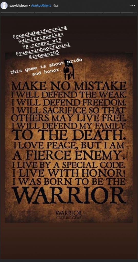 Το μέλος του Δ.Σ. της ΠΑΕ ΠΑΟΚ βρίσκεται στη Θεσσαλονίκη από το απόγευμα της Παρασκευής και θα βρεθεί στο γήπεδο για τη μεγάλη αναμέτρηση. Μάλιστα έκανε και μια ανάρτηση στο instagram με μια φράση από το «Warrior Culture Gear» στέλνοντας μήνυμα προς τον Άμπελ Φερέιρα και τους παίκτες του.