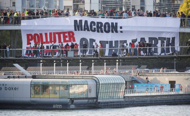 Οικολόγοι ακτιβιστές κατέλαβαν μια γέφυρα και μια πεζογέφυρα, απλώνοντας πανό. Σε ένα από αυτά, έγραφαν, στα αγγλικά: «Μακρόν, ο ρυπαντής της Γης».