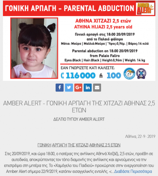 Με ανακοίνωση του το Χαμόγελο του Παιδιού ζητά πληροφορίες για αρπαγή της Χιτζαζί Αθηνάς ηλικίας 2,5 ετών.