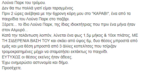 Οπως αναφέρει ο γονέας με ανάρτησή του, κινδύνεψαν μικρά παιδιά όταν αποκολλήθηκε γιρλάντα φωτισμού καταλήγοντας σε άδειες θέσεις του παιχνιδιού και σε ελάχιστη απόσταση από τα κεφαλιά παιδιών που βρισκόταν πάνω στο συγκεκριμένο παιχνίδι του λούνα παρκ.