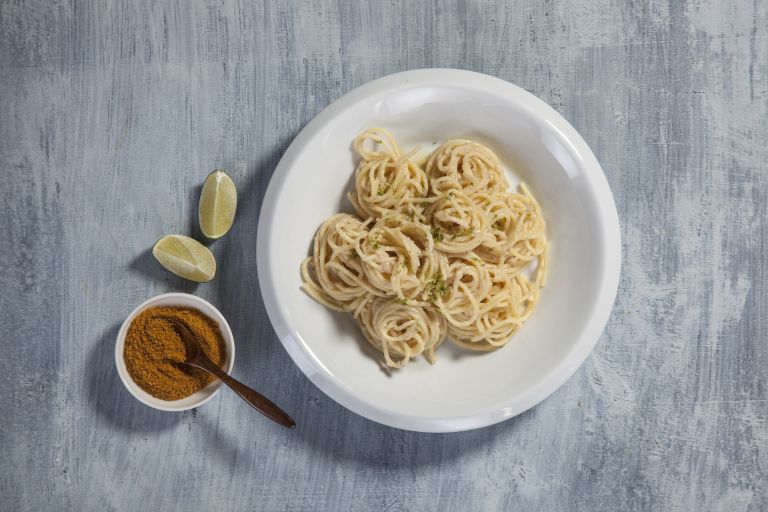 Σουρώνουμε το σπαγγέτι και κρατάμε λίγο από το νερό στο οποίο έβρασε (1 – 2 κουτάλες). Ρίχνουμε σε μια κατσαρόλα το λάδι και το βούτυρο και τοποθετούμε σε μέτρια προς δυνατή φωτιά. Οταν το μείγμα γίνει καφέ, αποσύρουμε από τη φωτιά και ανακατεύουμε μέσα τα μακαρόνια για να δώσουμε επιπλέον νοστιμιά. Τέλος, προσθέτουμε το μείγμα του μπλέντερ ή μούλτι και ανακατεύουμε να πάει σε όλα τα ζυμαρικά. Αν μας φαίνεται ότι είναι πολύ στεγνά, αραιώνουμε με λίγο από το νερό που κρατήσαμε από το βράσιμο του σπαγγέτι.