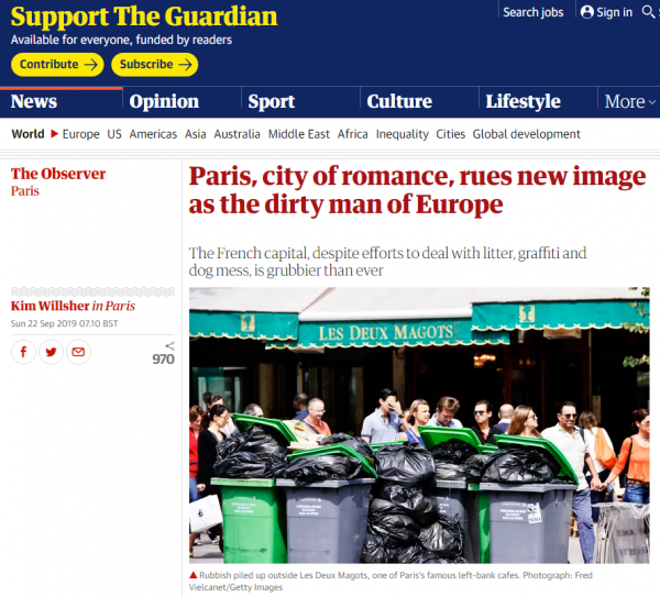 Σύμφωνα με την εφημερίδα, οι δρόμοι του Παρισιού έχουν μετατραπεί σε τεράστιο «σκουπιδοτενεκέ». Σκουπίδια, αποτσίγαρα και ακαθαρσίες από κατοικίδια ζώα συνθέτουν το σκηνικό. Τα παρατημένα σκούτερ και ποδήλατα δεν διευκολύνουν την κατάσταση.