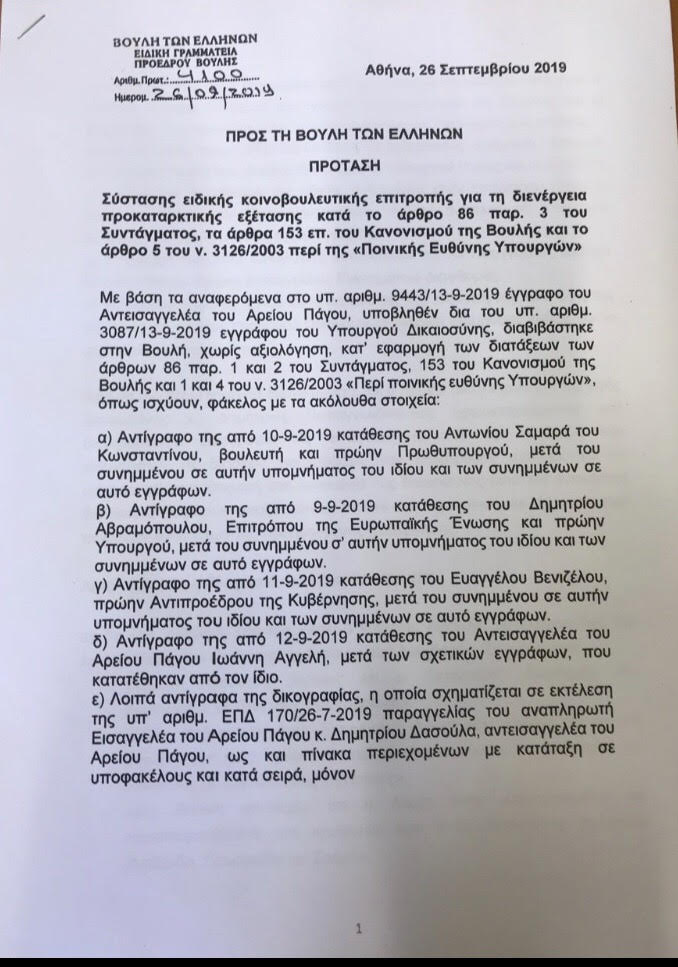 Τριάντα βουλευτές της ΝΔ κατέθεσαν σήμερα στη Βουλή πρόταση για τη σύσταση ειδικής κοινοβουλευτικής επιτροπής προς διενέργεια προκαταρκτικής εξέτασης κατά του Δ. Παπαγγελόπουλου για την υπόθεση Novartis.