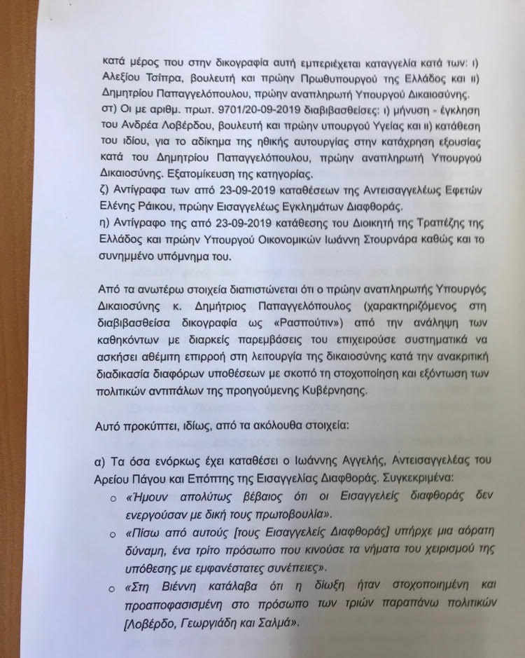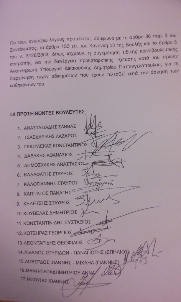 Η πρόταση των βουλευτών στηρίζεται στις καταθέσεις των κ.κ. Σαμαρά, Αβραμόπουλου, Λοβέρδου, Στουρνάρα και Ράικου με τον Δήμητρη Παπαγγελόπουλο – χαρακτηριζόμενος ως Ρασπούτιν – να διαπιστώνεται ότι από την ανάληψη των καθηκόντων του με διαρκείς παρεμβάσεις του επιχειρούσε συστηματικά να ασκήσει αθέμιτη επιρροή στη λειτουργία της δικαιοσύνης.