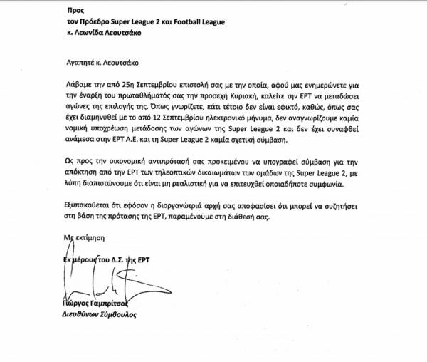 Η ΕΡΤ με επιστολή της στον πρόεδρο της Superleague 2, Λεωνίδα Λεουτσάκο, τόνισε ότι η πρόταση που έγινε χθες για ψαλίδι 12-20% στα τηλεοπτικά είναι μη ρεαλιστική – Χωρίς μετάδοση η 1η αγωνιστική