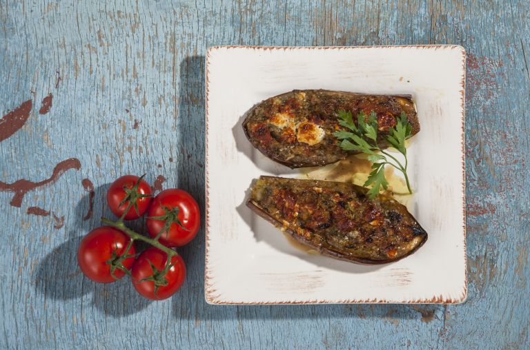Βγάζουμε τις μελιτζάνες από το αλατόνερο, τις στύβουμε καλά με τα χέρια και με ένα κουτάλι γεμίζουμε τη θήκη που έχουμε χαράξει κατά μήκος της σάρκας τους με το μείγμα της ντομάτας. Τις τοποθετούμε σε ταψάκι, τη μια δίπλα στην άλλη χωρίς να αφήνουμε κενά. Τις περιχύνουμε με τον χυμό λεμονιού, το ελαιόλαδο και 1 φλ. νερό. Σκεπάζουμε το ταψί με λαδόκολλα και σφραγίζουμε καλά με αλουμινόχαρτο. Μπορούμε επίσης να χρησιμοποιήσουμε γάστρα.
