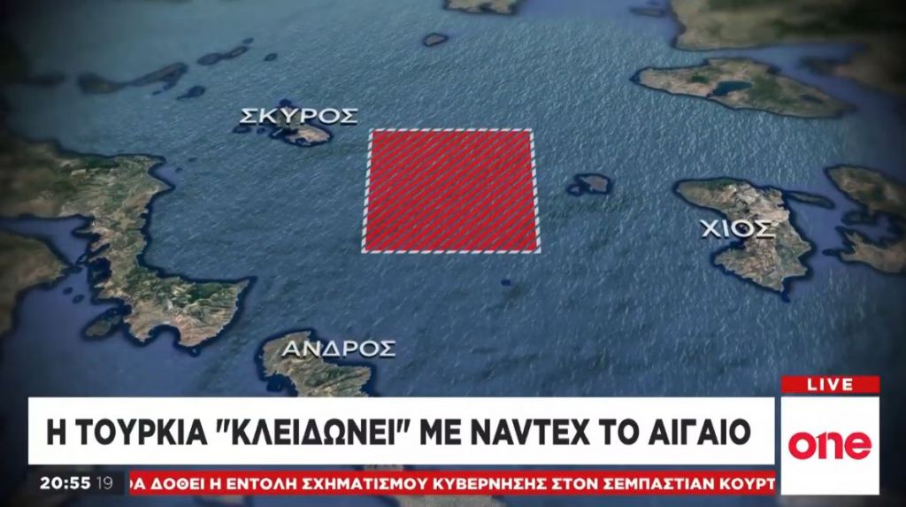 Συγκεκριμένα, με τη Navtex 1097/19 που εξέδωσε ο σταθμός της Σμύρνης, που δεν έχει καμιά σχετική δικαιοδοσία, δεσμεύει για ασκήσεις με πραγματικά πυρά την καρδιά του Αιγαίου και συγκεκριμένα μια μεγάλη θαλάσσια περιοχή ανάμεσα σε Σκύρο, Ψαρά, Εύβοια και Άνδρο.
