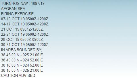 Συγκεκριμένα, ως προς το δεύτερο ζήτημα, η θαλάσσια περιοχή που «κατοχύρωσε» η Τουρκία είναι μέσα στο τρίγωνο Σκύρου- Άνδρου- Ψαρών / Χίου, με άλλα λόγια στην «καρδιά του Αιγαίου», ενώ όσον αφορά το χρονικό διάστημα, ο σταθμός του Ιζμίρ αναφέρει πως πρόκειται να διεξαχθούν ασκήσεις βολών όλο τον Οκτώβριο.
