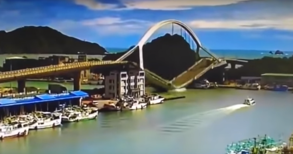 Μαγνητοσκοπημένες εικόνες από κάμερες ασφαλείας δείχνουν αυτή τη γέφυρα μήκους 140 μέτρων που βρίσκεται στη Νανφανγκάο, στην ανατολική ακτή της Ταϊβάν, τη στιγμή που καταρρέει και πέφτει πάνω σε αλιευτικά που ήταν ελλιμενισμένα από κάτω. Ένα βυτιοφόρο φαίνεται επίσης να πέφτει από τη γέφυρα.