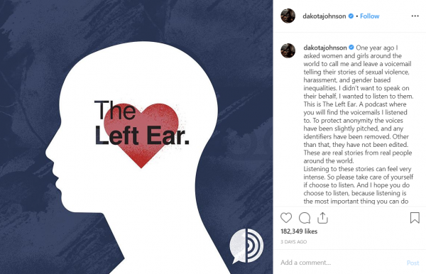 «The Left Ear» είναι ο τίτλος του podcast τη δημιουργία του οποίου ανακοίνωσε η Ντακότα Τζόνσον, το οποίο περιλαμβάνει φωνητικά μηνύματα γυναικών με ιστορίες σεξουαλικής βίας, παρενοχλήσεων και διαφυλικών ανισοτήτων