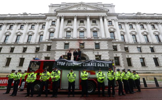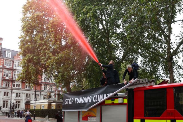 Ακτιβιστές κατά της κλιματικής αλλαγής χρησιμοποίησαν την Πέμπτη ένα πυροσβεστικό όχημα για να ρίξουν κόκκινη μπογιά στην πρόσοψη του βρετανικού υπουργείου Οικονομικών, στην προσπάθεια να προσελκύσουν την προσοχή για την αποτυχία, όπως τη χαρακτηρίζουν, της κυβέρνησης να αποτρέψει την κλιματική καταστροφή η οποία ελλοχεύει.