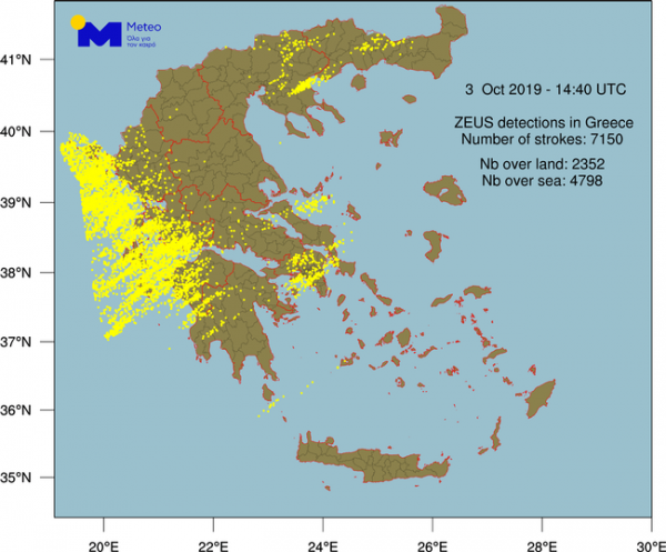 Χθες, το σύστημα «ΖΕΥΣ» του Εθνικού Αστεροσκοπείου Αθηνών / meteo.gr, κατέγραψε περί τους 7.000 κεραυνούς πάνω από την ελληνική επικράτεια, με 2.300 από αυτούς να εντοπίζονται πάνω από την ξηρά.