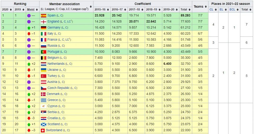 Αναλυτικά το πως έχει διαμορφωθεί η κατάσταση στο top 20 της βαθμολογίας της UEFA.