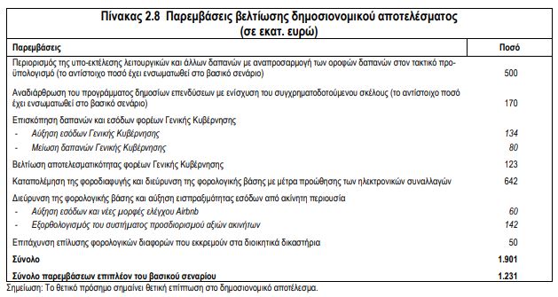 Το συνολικό ύψος των παρεμβάσεων αυτών υπολογίζεται σε 1,9 δισ. ευρώ και υπερκαλύπτει τις φορο-ελαφρύνσεις 1,2 δισ. ευρώ, ενώ σημειώνεται ότι αν δεν επιτευχθεί ο στόχος θα υπάρξουν πρόσθετα μέτρα (επισκόπηση δαπανών κά) ύψους 1,2 δισ. ευρώ, ώστε να επιτευχθεί με βεβαιότητα ο στόχος για το πρωτογενές πλεόνασμα