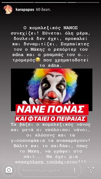 Στη συνέχεια «χτύπησε» ξανά γράφοντας χαρακτηριστικά: «Τιμή μου και καμάρι μου να είμαι υπάλληλος μικρέ κομπλεξικέ νάνε. Δουλεύω όλη μέρα, δεν ξύνομαι σαν εσένα και είμαι ευλογημένος να δίνω όλο μου το χρόνο στην ομάδα που λατρεύω! Ο λαός στην Ελλάδα (θα το μάθεις κάποτε κι εσύ και ο μπαμπάς σου) γελάει με τους κλόουν και τα πρόβατα τους! όχι με όσους εργάζονται σκληρά… »