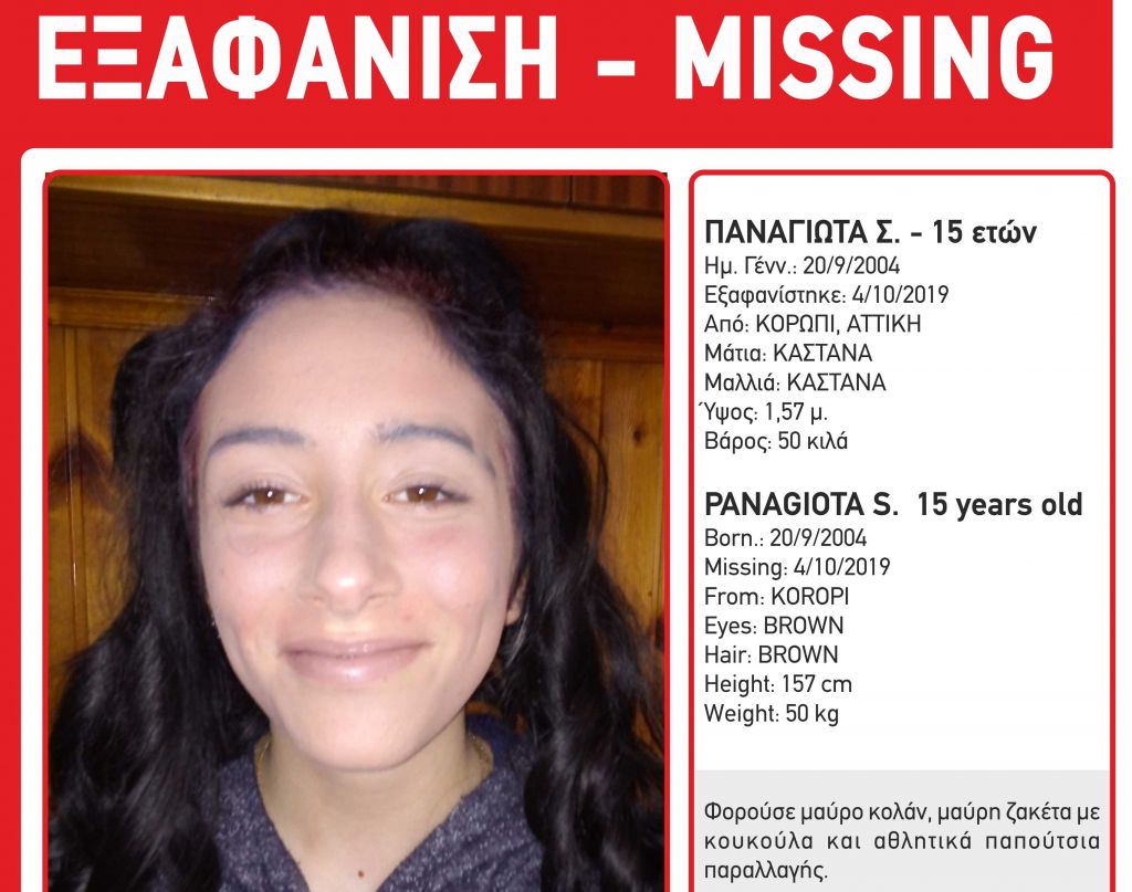«Στις 04/10/2019 και ώρα 16:00, εξαφανίστηκε από την περιοχή του Κορωπίου, η Παναγιώτα Σ., 14 ετών» αναφέρει το Χαμόγελο του Παιδιού.