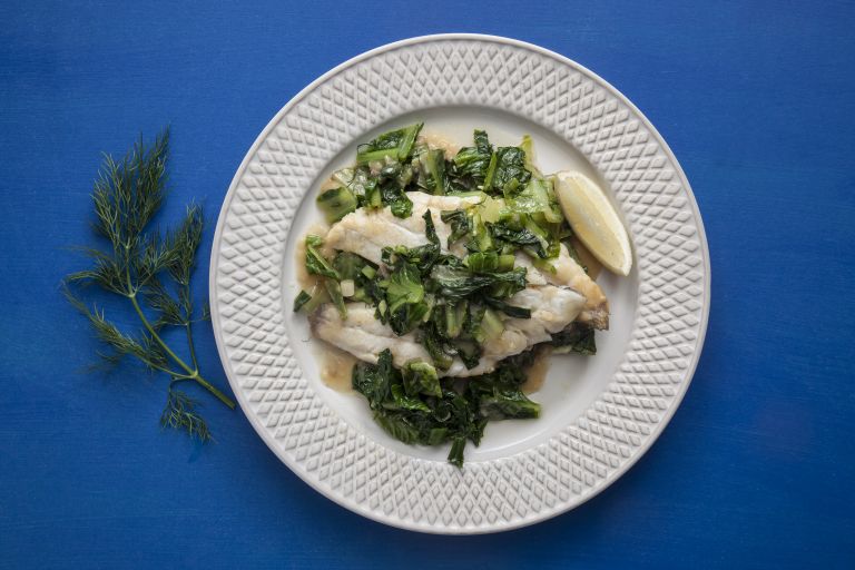 Κατόπιν προσθέτουμε τα φιλέτα του ψαριού, πασπαλίζουμε με άνηθο, αλάτι και πιπέρι, σκεπάζουμε με το καπάκι και αφήνουμε στη φωτιά για περίπου 10 λεπτά. Περιχύνουμε με τον χυμό λεμονιού και αποσύρουμε από τη φωτιά.