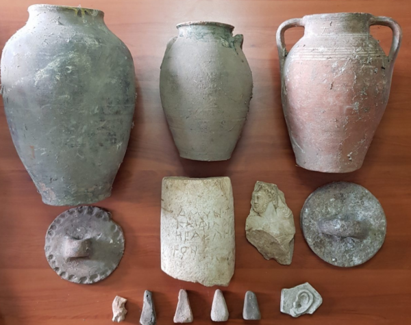 Όπως ανακοίνωσε η αστυνομία, κατόπιν αξιοποίησης στοιχείων πραγματοποιήθηκε έρευνα στο σπίτι του, όπου κατασχέθηκαν «ένα τμήμα μαρμάρινου ανάγλυφου ωτός με μη διαμπερή οπή, απότμημα μαρμάρινου ανάγλυφου με γενειοφόρο ανδρική μορφή, τέσσερις αγνύθες με πυραμοειδή μορφή, τμήμα αγγείου με λαβή, δύο πώματα με ταινιωτή λαβή, τμήμα μαρμάρινου κίονα με επιγραφή και τρία αγγεία με εφυάλωση».