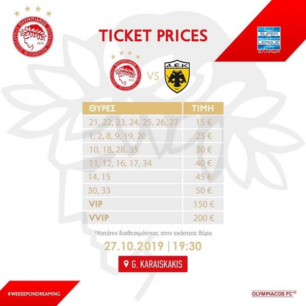Τα εισιτήρια του αγώνα θα διατίθενται από τα εκδοτήρια του γηπέδου «Γ. ΚΑΡΑΪΣΚΑΚΗΣ», που βρίσκονται έξω από τη Θύρα 25, από Δευτέρα 14/10 και καθημερινά έως Παρασκευή 25/10 (10:00 – 18:00) ή έως την εξάντλησή τους.