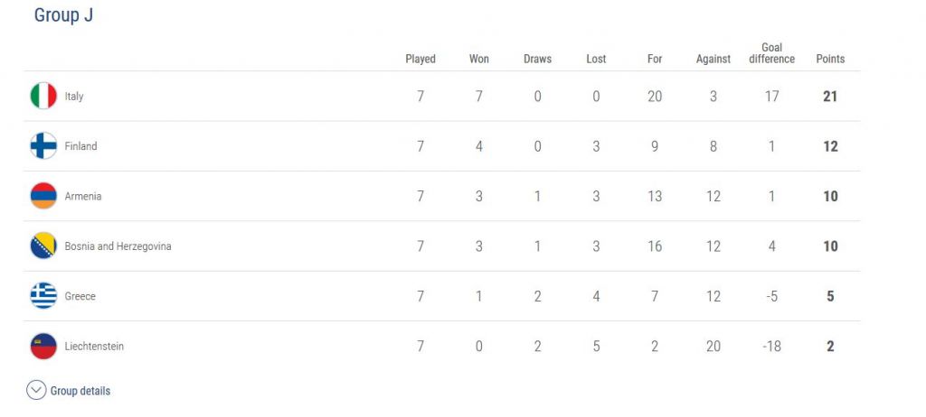 Η Ελλάδα ηττήθηκε από την Ιταλία και είναι στην προτελευταία θέση με 5 βαθμούς, πάνω μόνο από το Λιχτενστάιν – Το απόλυτο η Ιταλία – Αναλυτικά τα αποτελέσματα και η βαθμολογία.