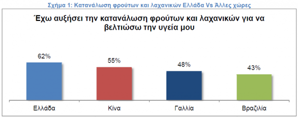Στην Ελλάδα το ποσοστό των καταναλωτών που δηλώνουν χορτοφάγοι δεν ξεπερνά το 3%, αλλά υπάρχει ένα έντονο ενδιαφέρον για αύξηση της κατανάλωσης φρούτων και λαχανικών, το οποίο είναι σημαντικά πιο έντονο από άλλες χώρες, με το 62% του κοινού να δηλώνει ότι έχει αυξήσει την κατανάλωση φρούτων και λαχανικών με στόχο τη βελτίωση της υγείας τους.