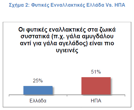 Η προαναφερθείσα τάση, αναμένεται να κάνει πιο έντονη την αναζήτηση για εναλλακτικά υλικά, τρόφιμα και προϊόντα προκειμένου να καλυφθούν οι υπάρχουσες διατροφικές συνήθειες. Προϊόντα όπως το φυτικό τυρί, τα φυτικά γάλατα κλπ υπάρχουν ήδη στην ελληνική αγορά, με το επόμενο βήμα να είναι το κρέας εργαστηρίου ή από φυτικά συστατικά. Υπάρχει άλλωστε ήδη ένα καταναλωτικό κοινό που κάνει τις συγκεκριμένες διατροφικές επιλογές, αν και σε χαμηλότερο ποσοστό σε σχέση με το εξωτερικό. Χαρακτηριστικό είναι ότι όπως φαίνεται στο σχήμα 2, το 25% του κοινού θεωρεί αυτές τις επιλογές πιο υγιεινές, έναντι 51% στις ΗΠΑ.