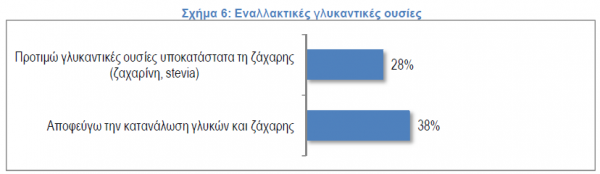 Χαρακτηριστικό παράδειγμα είναι ότι μια από τις τροφές η οποία ενοχοποιείται όλο και περισσότερο στα μάτια του καταναλωτικού κοινού ως ανθυγιεινή είναι η ζάχαρη. Η στροφή προς εναλλακτικές πηγές όπως είναι η ζαχαρίνη και η στέβια φαίνεται ότι κερδίζει έδαφος με το 28% του κοινού να επιλέγει αυτές τις εναλλακτικές. Παράλληλα ένα 38% του κοινού δηλώνει ότι γενικότερα αποφεύγει την κατανάλωση γλυκών και ζάχαρης με το – θεωρητικό – αθροιστικό ποσοστό να φτάνει το 66%, αφήνοντας πλέον μία μειοψηφία να παραμένει αφοσιωμένη στην παραδοσιακή κρυσταλλική επιλογή.