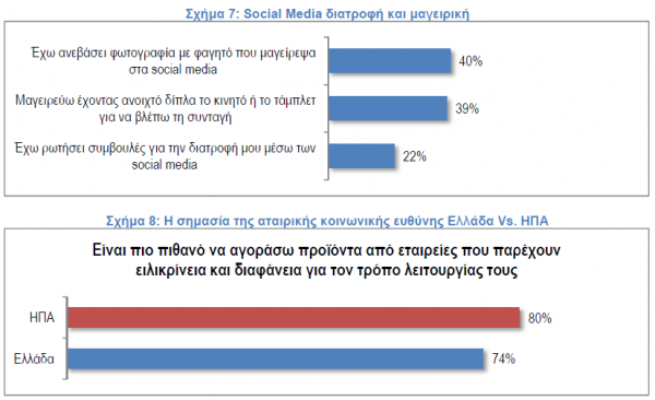Τα social media όλο και πιο έντονα θα διαμορφώνουν τις επιλογές του καταναλωτικού κοινού με τις αγορές τροφίμων, τη μαγειρική και την κατανάλωση να συνδέονται με το internet όλο και περισσότερο. Το 39% του κοινού (σχήμα 7) μαγειρεύει σήμερα έχοντας ανοιχτό το κινητό δίπλα για να βλέπει συνταγές, ενώ το 22% έχει ρωτήσει ενεργά συμβουλές μέσω των social media. Πλέον η νοικοκυρά του σπιτιού δεν μαγειρεύει μόνο για την οικογένεια, αλλά και για ένας ευρύτερο κύκλο με το 40% των ερωτώμενων να δηλώνουν ότι έχουν ανεβάσει φωτογραφία με το φαγητό τους στο διαδίκτυο. Οι influencers θα αποχτήσουν πιο ενεργούς ρόλους και επηρεάζουν περισσότερο τις εξελίξεις. Οι ταχύτητες διάδοσης πληροφοριών και υιοθέτησης τάσεων γίνονται όλο και πιο γρήγορες, δημιουργώντας την ανάγκη για τις επιχειρήσεις και να ακολουθούν σε αυτούς του ρυθμούς, αλλά κυρίως να έχουν παρουσία σε αυτά τα μέσα.