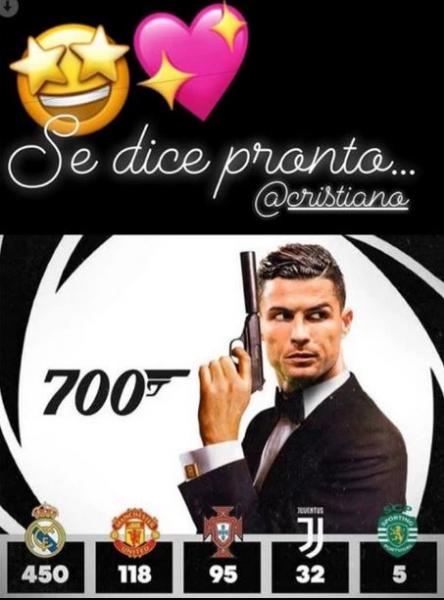 Ο «Mr. 700 γκολ στην επαγγελματική του καριέρα» έγινε τώρα και… Τζέιμς Μποντ. Ή τουλάχιστον αυτό πιστεύει η σύντροφος του Πορτογάλου σταρ, Χεορχίνα Ροντρίγκεζ, η οποία ποστάρισε στα social media μία φωτογραφία με τον Κριστιάνο Ρονάλντο μεταμφιεσμένο σε Τζέιμς Μποντ, δίπλα του τον αριθμό 700 (και όχι 007) και από κάτω όσα γκολ έχει βάλει σε όλες τις ομάδες στις οποίες έχει αγωνιστεί.