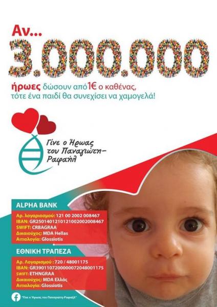 Αποφασισμένος να συνεχίσει την προσπάθεια συγκέντρωσης των περίπου 3 εκατομμυρίων ευρώ, χρήματα που απαιτούνται για την μεταφορά και νοσηλεία του μικρού Παναγιώτη Ραφαήλ από τη Χαλκίδα στις ΗΠΑ, είναι ο πατέρας του. «Το παιδί μου είναι αποφασισμένο, το παιδί μου με οδηγεί και είναι μαζί μου όλος ο κόσμος, όλη η Ελλάδα».
