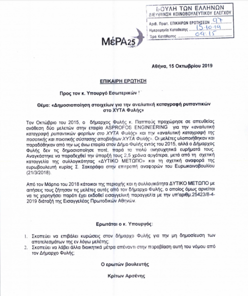 Υπενθυμίζεται ότι ο κ. Αρσένης στην ερώτησή του αναφέρει ότιο 2015 ο δήμαρχος Φυλής κ. Παππούς προχώρησε σε απευθείας ανάθεση δύο μελετών στην εταιρεία «ASPROFOS ENGINEERING» για την αναλυτική καταγραφή ρυπαντικών φορτίων στο ΧΥΤΑ Φυλής και την αναλυτική καταγραφή της ποσοτικής και ποιοτικής σύστασης αποβλήτων ΧΥΤΑ Φυλής. Ωστόσο, κατά λάθος την είχε απευθύνη προς τον υπουργό Εσωτερικών της Κύπρου και όχι προς τον Τάκη Θεοδωρικάκο.
