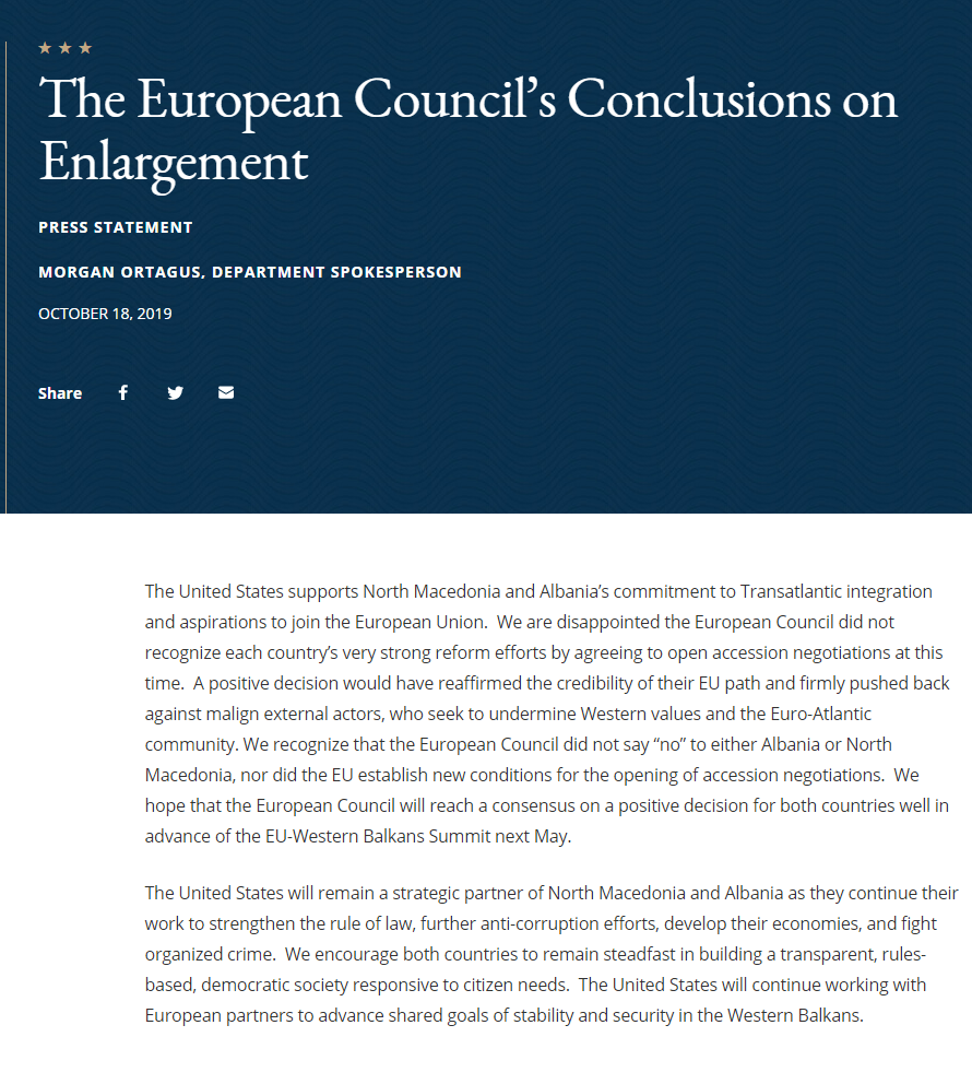«Οι Ηνωμένες Πολιτείες υποστηρίζουν τη δέσμευση της Βόρειας Μακεδονίας και Αλβανίας για διατλαντική ολοκλήρωση και τις φιλοδοξίες τους για ένταξη στην Ευρωπαϊκή Ένωση. Είμαστε απογοητευμένοι που το Ευρωπαϊκό Συμβούλιο δεν αναγνώρισε τις πολύ ισχυρές μεταρρυθμιστικές προσπάθειες των χωρών συμφωνώντας να ξεκινήσουν οι διαπραγματεύσεις ένταξης αυτή τη στιγμή. Μια θετική απόφαση θα είχε επιβεβαιώσει την αξιοπιστία της ευρωπαϊκής τους πορείας και θα κακοήθεις εξωτερικούς παράγοντες, που επιδιώκουν να υπονομεύσουν τις δυτικές αξίες και την ευρωατλαντική κοινότητα.